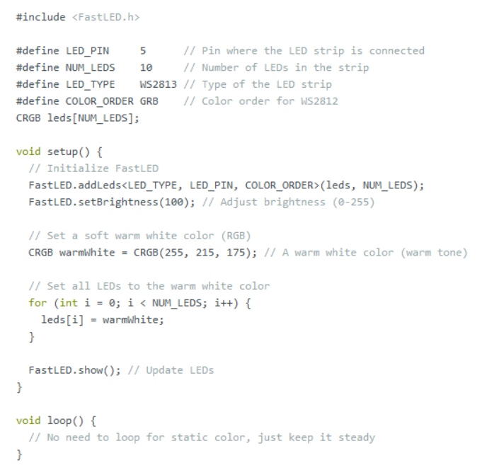 為了確保一切正常工作,我編寫了一個(gè)簡(jiǎn)單的測(cè)試代碼,產(chǎn)生柔和、溫暖的白光。