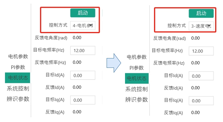 設(shè)置保護(hù)和辨識參數(shù)→啟動電機(jī)參數(shù)辨識→啟動速度閉環(huán)控制