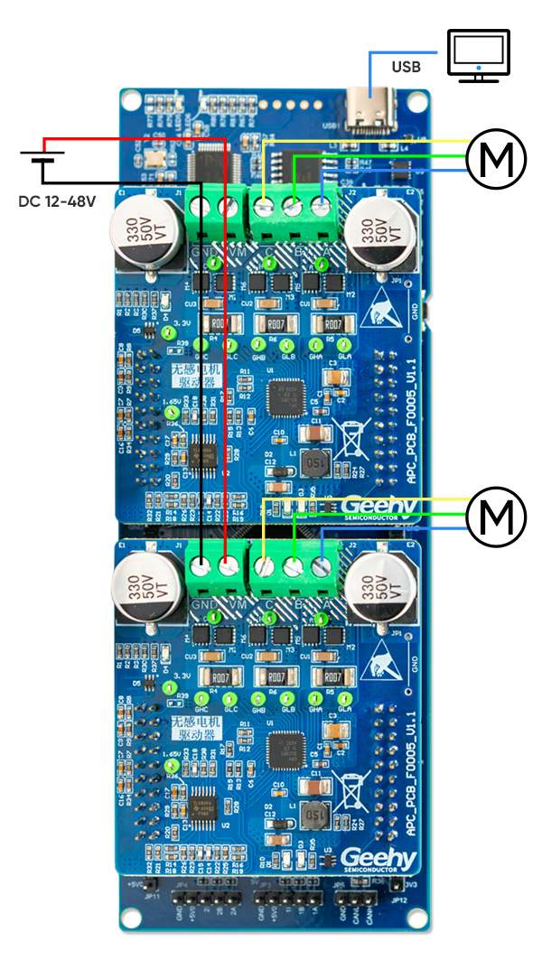 設(shè)置好撥碼、燒寫完成固件之后,按下圖連接電源、電機(jī)和PC。開啟電源,連接上位機(jī)測試電機(jī)控制功能。