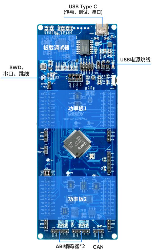 ■  控制板為G32R501 Eval Board,搭載板上調(diào)試器CMSIS-DAP,用Type-C數(shù)據(jù)線連接電腦即可調(diào)試。Type-C接口通過隔離芯片傳輸信號,斷開USB電源跳線后,與板上電路電氣隔離,避免調(diào)試過程中有害電壓損壞電腦;