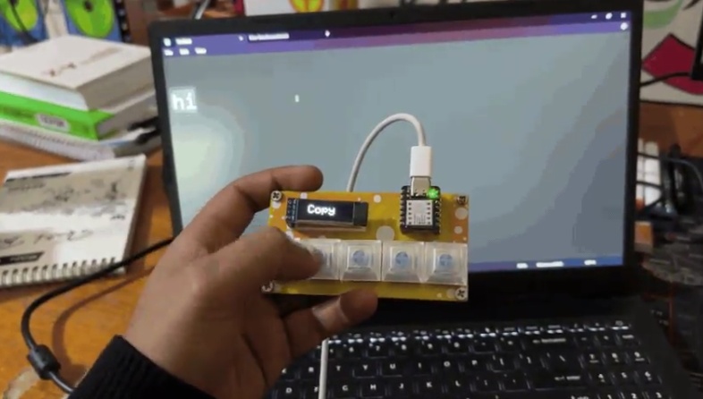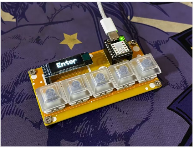 這個(gè)macropad允許我們復(fù)制和粘貼任何東西,上下滾動(dòng)網(wǎng)頁(yè),甚至利用輸入命令,選擇的命令顯示在OLED屏幕上。