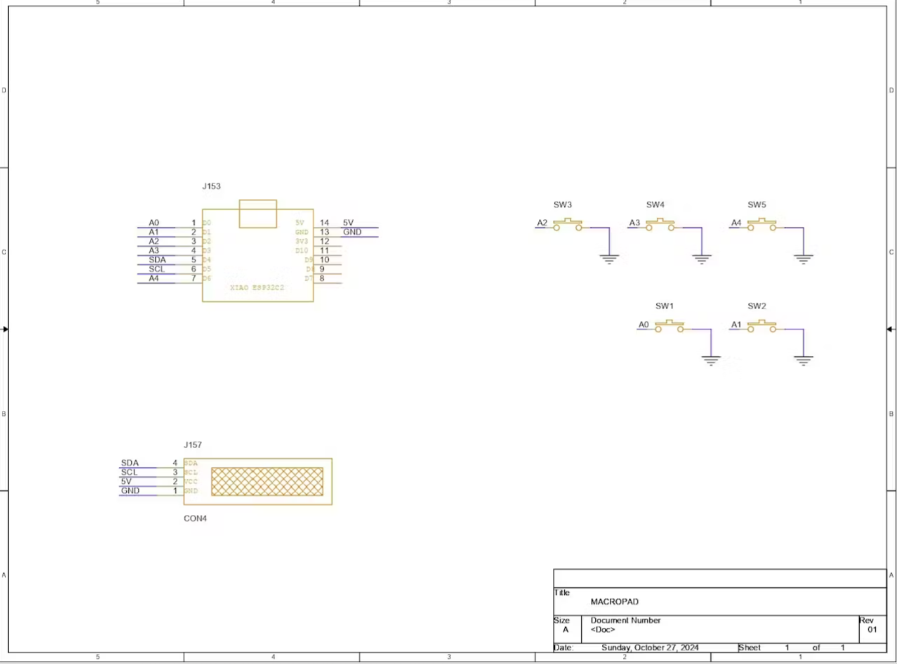根據(jù)3D模型的結(jié)論,我們開(kāi)始制作這個(gè)項(xiàng)目的原理圖,它由五個(gè)機(jī)械開(kāi)關(guān)連接到一個(gè)XIAO和一個(gè)OLED屏幕。