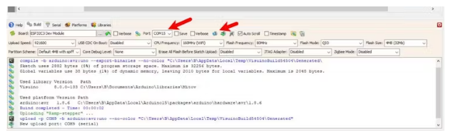 在Visuino中,在底部單擊“Build”選項(xiàng)卡,確保選擇了正確的端口,然后單擊“Compile/Build and Upload”按鈕。
