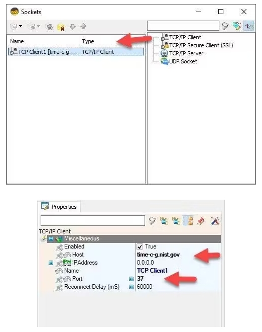 ?在編輯器左側(cè)選擇模塊>Wifi>插座,點(diǎn)擊[…]按鈕,使“套接字”窗口將打開從右側(cè)拖動TCP/IP客戶端到左側(cè),然后在屬性窗口下設(shè)置端口:37和主機(jī):time-c . g.nist.gov