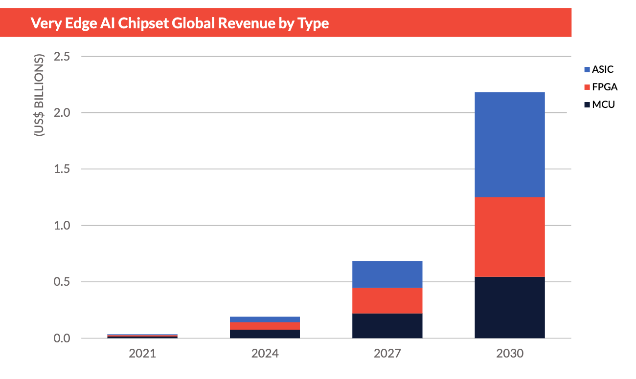ABI Research 預(yù)測,到 2030 年,邊緣端 TinyML MCU 市場復(fù)合年增長率達到 113%。TinyML 的增長與 IoT 設(shè)備的爆炸式增長直接相關(guān),全球物聯(lián)網(wǎng)設(shè)備將從 2020 年的 66 億臺增長到 2026 年的 237.2 億臺。每個新設(shè)備和連接都代表著 AI 和 ML 的機會,因此,TinyML 市場的出貨量將從 2020 年的 1520 萬件增長到 2030 年的 25 億件。