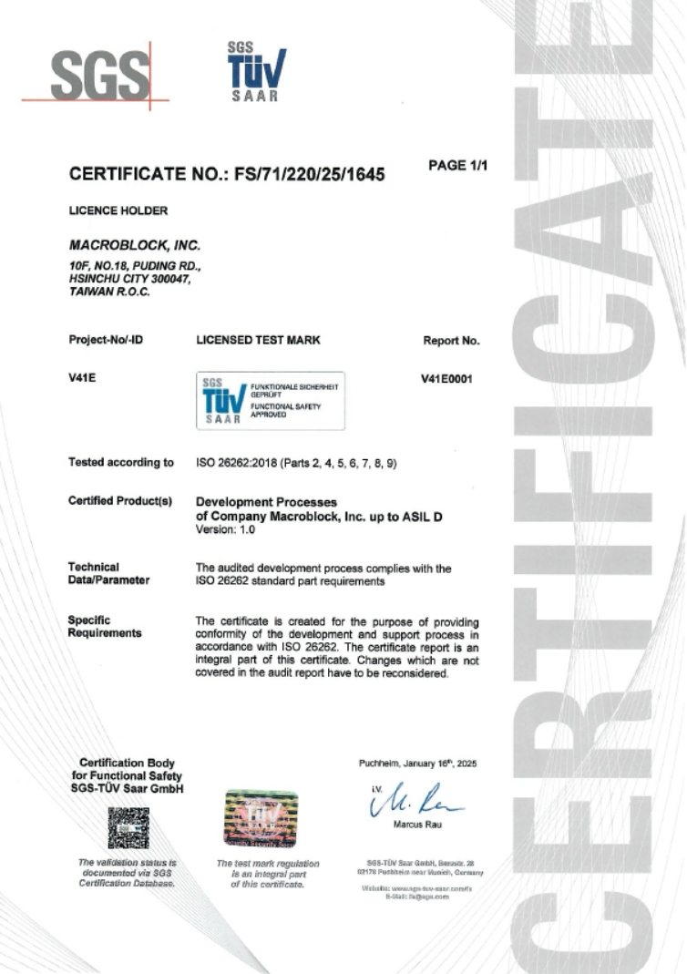 聚積科技股份有限公司已建立車用電子功能安全開發(fā)流程,并獲得ISO26262認(rèn)證,這一國際性的權(quán)威認(rèn)證呼應(yīng)了聚積科技對汽車行業(yè)最高功能安全標(biāo)準(zhǔn)的堅持。