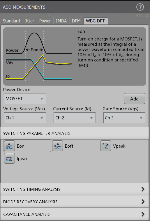 圖16:適用于4/5/6系列MSO的WBG-DPT選項(xiàng),可自動(dòng)化雙脈沖測試的測量,包括開關(guān)參數(shù)、時(shí)間、二極管恢復(fù)和電容分析。