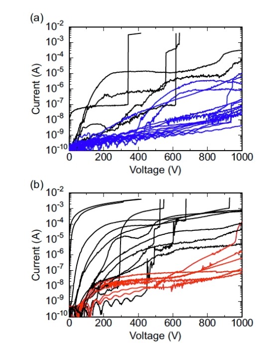 將這種Na-Flux晶圓制成的18個(gè)PN二極管的反向泄漏特性與在市售HVPE GAN底物上制造的相同狹窄進(jìn)行了比較。圖4顯示了靜脈特征。在這里,藍(lán)色和紅色曲線分別表示Na-Flux和商業(yè)晶圓的良好模具。 Na-Flux晶圓的產(chǎn)量(假設(shè)在600 V時(shí)的標(biāo)準(zhǔn)<1μA泄漏和BV> 800 V的標(biāo)準(zhǔn)為72%,而商業(yè)晶圓的產(chǎn)量?jī)H為33%。該產(chǎn)量可能與可能在設(shè)備處理過(guò)程中形成的缺陷有關(guān)。