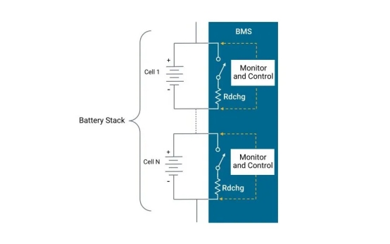 圖2 A BMS監(jiān)視每個(gè)單元格,并利用晶體管開關(guān)和適當(dāng)尺寸的放電電阻與每個(gè)單元并聯(lián)。