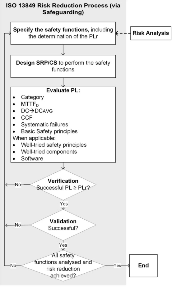 ISO 13849標(biāo)準(zhǔn)定義了一個(gè)迭代過(guò)程,在該過(guò)程中,對(duì)SRP/CS設(shè)計(jì)進(jìn)行評(píng)估以確定所達(dá)到的PL并檢查安全水平是否足夠或必須在新的環(huán)中改進(jìn)。該過(guò)程包括降低風(fēng)險(xiǎn)的三種不同方法:通過(guò)安全設(shè)計(jì)措施降低風(fēng)險(xiǎn),通過(guò)保障措施降低風(fēng)險(xiǎn)以及通過(guò)信息降低風(fēng)險(xiǎn)。 ISO 13849支持通過(guò)保護(hù)風(fēng)險(xiǎn)的降低風(fēng)險(xiǎn)(圖3)。