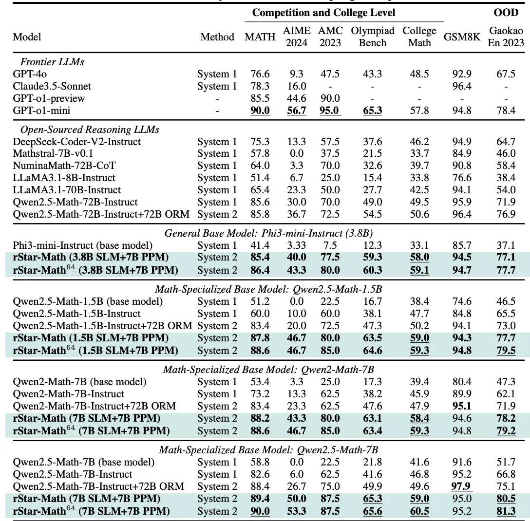 表5:最具挑戰(zhàn)性的數(shù)學(xué)基準(zhǔn),RSTAR-MATH和其他Frontier LLM的結(jié)果。 RSTAR-MATH64顯示在采樣64個(gè)軌跡時(shí)達(dá)到的通行證@1的準(zhǔn)確性。” - 從紙上。