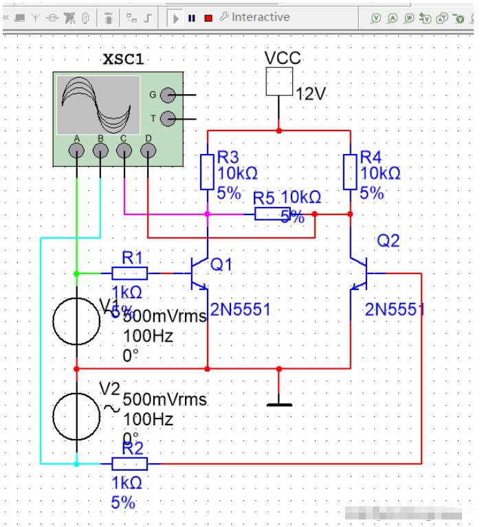 差分式放大電路是基本的直接耦合放大電路。雙擊示波器圖標,調(diào)節(jié)X軸掃描為2mS/Div,A通道Y軸幅度2V/Div,偏置2;B通道Y軸幅度2V/Div,偏置1;C通道AC,Y軸幅度10V/Div,偏置-1;D通道AC,Y軸幅度10V/Div,偏置-2。打開電源開關(guān),即可以觀察到兩個輸入信號和兩個輸出信號的波形。容易看出,由于偏置太小,輸出波形有明顯的失真。