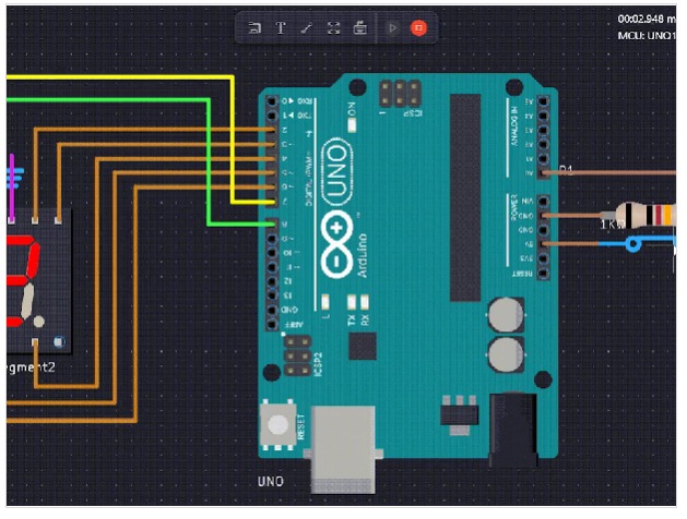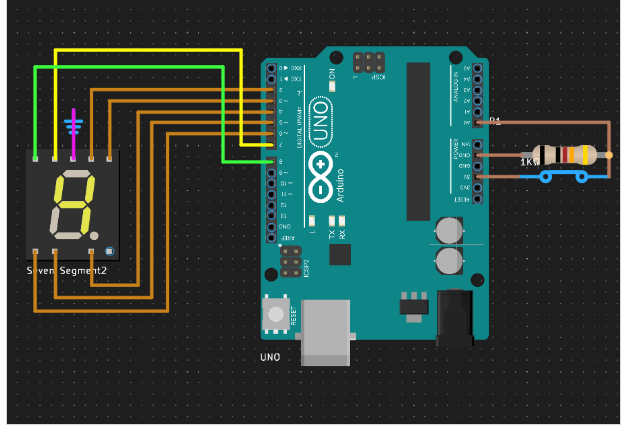 當(dāng)按下開關(guān)時(shí),Arduino UNO通過生成1到6之間的隨機(jī)數(shù)來模擬擲骰子。這個(gè)數(shù)字然后顯示在七段顯示器上,提供骰子滾動(dòng)結(jié)果的視覺表示。Dice Simulator項(xiàng)目是一種簡單而有效的方法,用于演示在基于arduino的項(xiàng)目中使用隨機(jī)數(shù)生成,并且可以擴(kuò)展到各種交互式應(yīng)用程序,例如游戲或概率實(shí)驗(yàn)。
