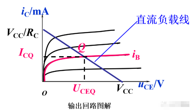 輸出回路:IC和UCE的關(guān)系式,UCE=Vcc-IC*RC=>IC=-UCE/RC+Vcc/RC。