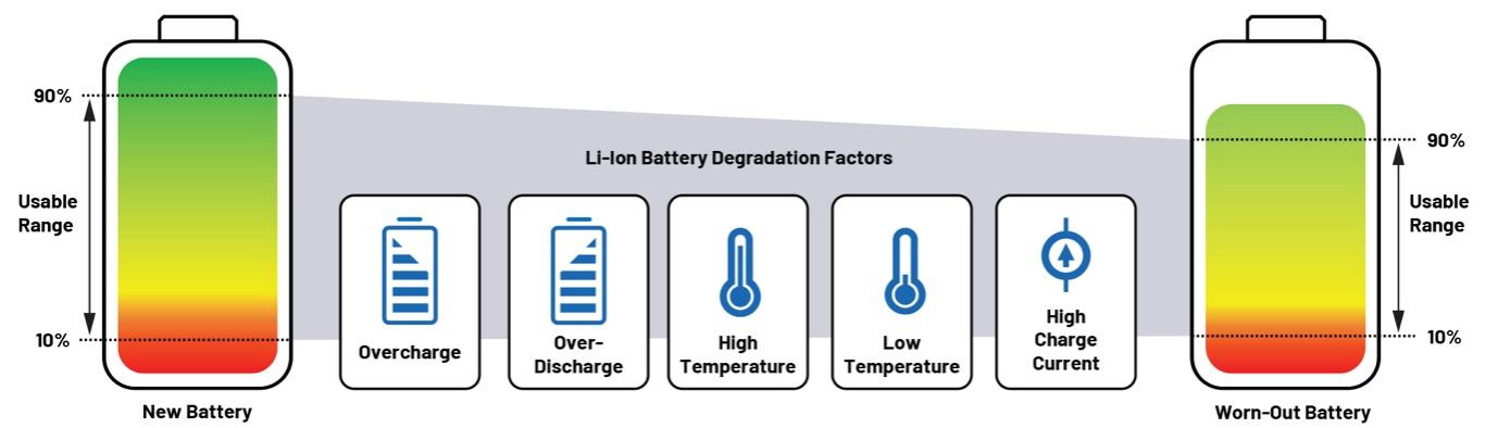 圖5列舉了造成鋰離子電池退化的一些因素。值得注意的是,這些因素可能會引起燃燒和爆炸等危險情況,并且可能會迅速釀成災難2。