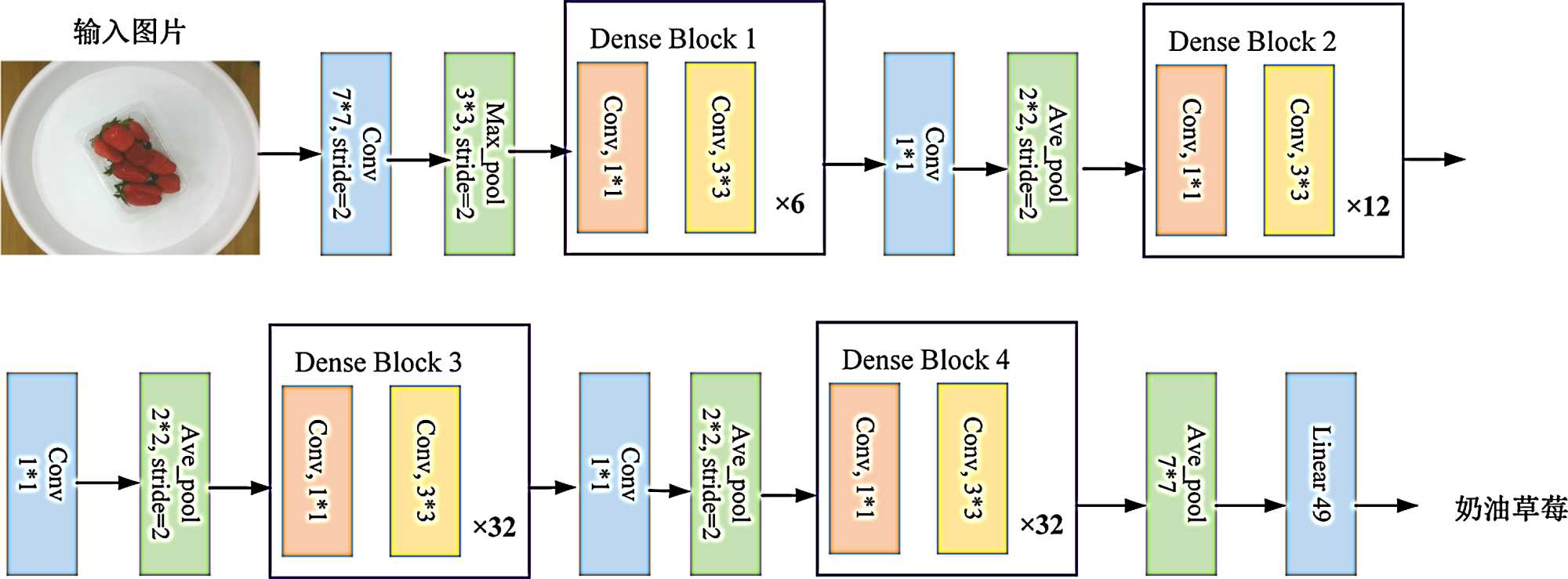 針對(duì)移動(dòng)端的水果識(shí)別應(yīng)用部署,本文選用內(nèi)存為2 GB的Rockchip RK3399-mid芯片,因此需要考慮模型權(quán)重大小和模型計(jì)算量。因此本文對(duì)模型的篩選規(guī)則為模型計(jì)算量(FLOPS/106)小于10,000,模型參數(shù)量小于100 M。通過(guò)對(duì)目前主流的網(wǎng)絡(luò)模型進(jìn)行篩選,本文選用DenseNet-169 [30]為本文的骨干網(wǎng)絡(luò),用于后續(xù)的研究,其模型結(jié)構(gòu)如圖1所示。
