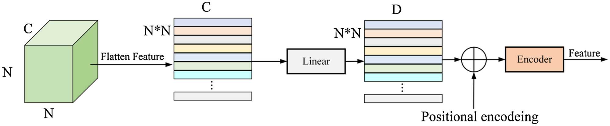 因此為提升模型深層語(yǔ)義提取能力,增強(qiáng)泛化性。本文實(shí)現(xiàn)適合在CNN模型中添加的ViT Block,其模型結(jié)構(gòu)如圖3所示,通過(guò)對(duì)三維輸入特征按照形狀依次展平變成二維特征,并進(jìn)行線性映射實(shí)現(xiàn)通道特征融合得到新的長(zhǎng)度為D的二維特征,然后對(duì)特征進(jìn)行位置編碼,輸入Encoder塊,進(jìn)行深層特征抽取,并輸出特征。