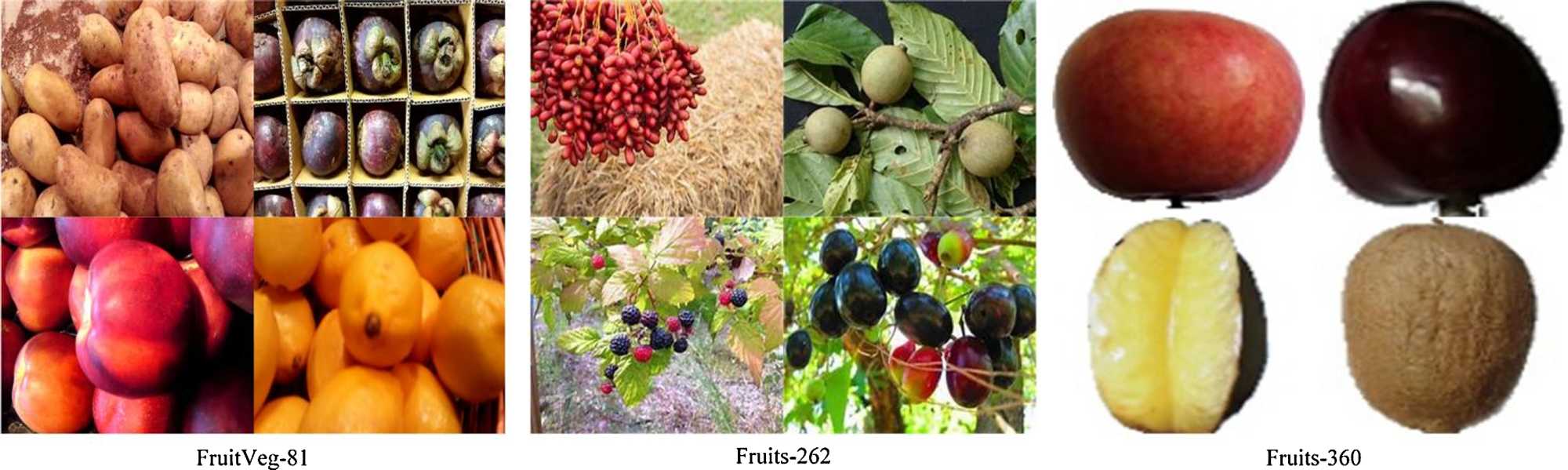 目前常見(jiàn)的水果數(shù)據(jù)集包括FruitVeg-81 [26]、Fruits-262 [27]、Fruits-360 [28]等,其中數(shù)字代表數(shù)據(jù)集中水果種類數(shù)量,圖5展示了部分上述水果數(shù)據(jù)集的圖片。可以看出盡管Fruits-360的水果種類眾多,但相對(duì)于其他數(shù)據(jù)集過(guò)于簡(jiǎn)單,不適合實(shí)際超市場(chǎng)景的應(yīng)用。FruitVeg-81數(shù)據(jù)集除了水果圖片,還包含了蔬菜圖片,并且果蔬類別數(shù)量相較于Fruits-262較少,因此在公開(kāi)數(shù)據(jù)集中,F(xiàn)ruits-262數(shù)據(jù)集更加適合作為水果識(shí)別系統(tǒng)模型訓(xùn)練數(shù)據(jù)集。