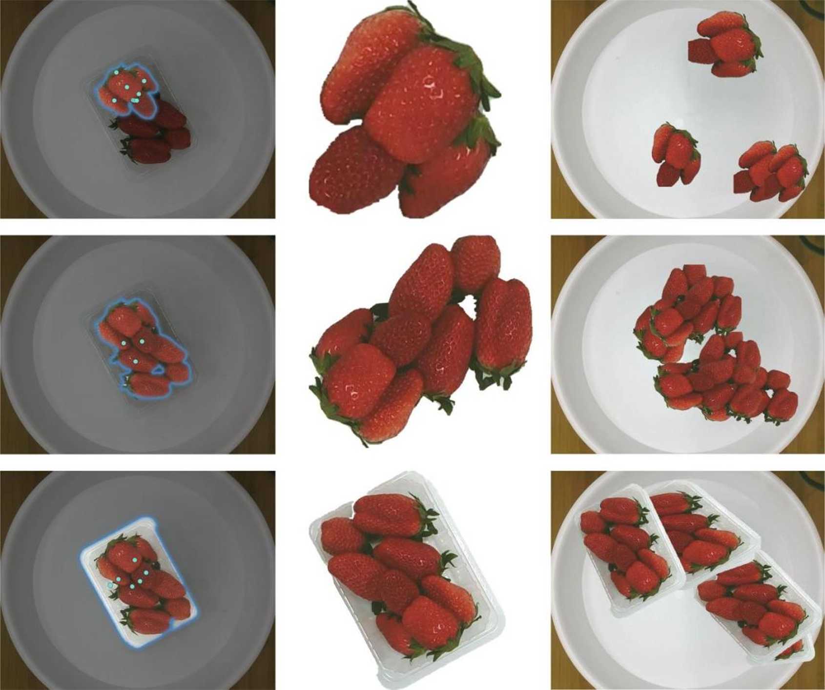數(shù)據(jù)集擴(kuò)增有助于提升模型泛化性和識(shí)別精度,防止過(guò)擬合。Meta開(kāi)源的SAM (Segment Anything Model) [29]實(shí)現(xiàn)了無(wú)需標(biāo)注即可對(duì)任意圖像中的任何物體進(jìn)行分割。本文基于SAM設(shè)計(jì)了水果數(shù)據(jù)集擴(kuò)增方法。將圖片傳入SAM,隨機(jī)生成多個(gè)提示輸入,對(duì)圖像進(jìn)行分割,得到分割對(duì)象。然后對(duì)分割對(duì)象進(jìn)行1到4次隨機(jī)復(fù)制,并隨機(jī)翻轉(zhuǎn)、旋轉(zhuǎn)、縮放,在背景圖像上隨機(jī)粘貼,完成數(shù)據(jù)擴(kuò)增。如圖8所示,對(duì)同一張草莓圖像隨機(jī)生成提示點(diǎn)進(jìn)行擴(kuò)充,左列為隨機(jī)提示點(diǎn),中間為分割實(shí)例,右列為最終擴(kuò)充圖。最終,每種水果圖片擴(kuò)增至6000張,總計(jì)29.4萬(wàn)張,命名為DailyFruit-49。