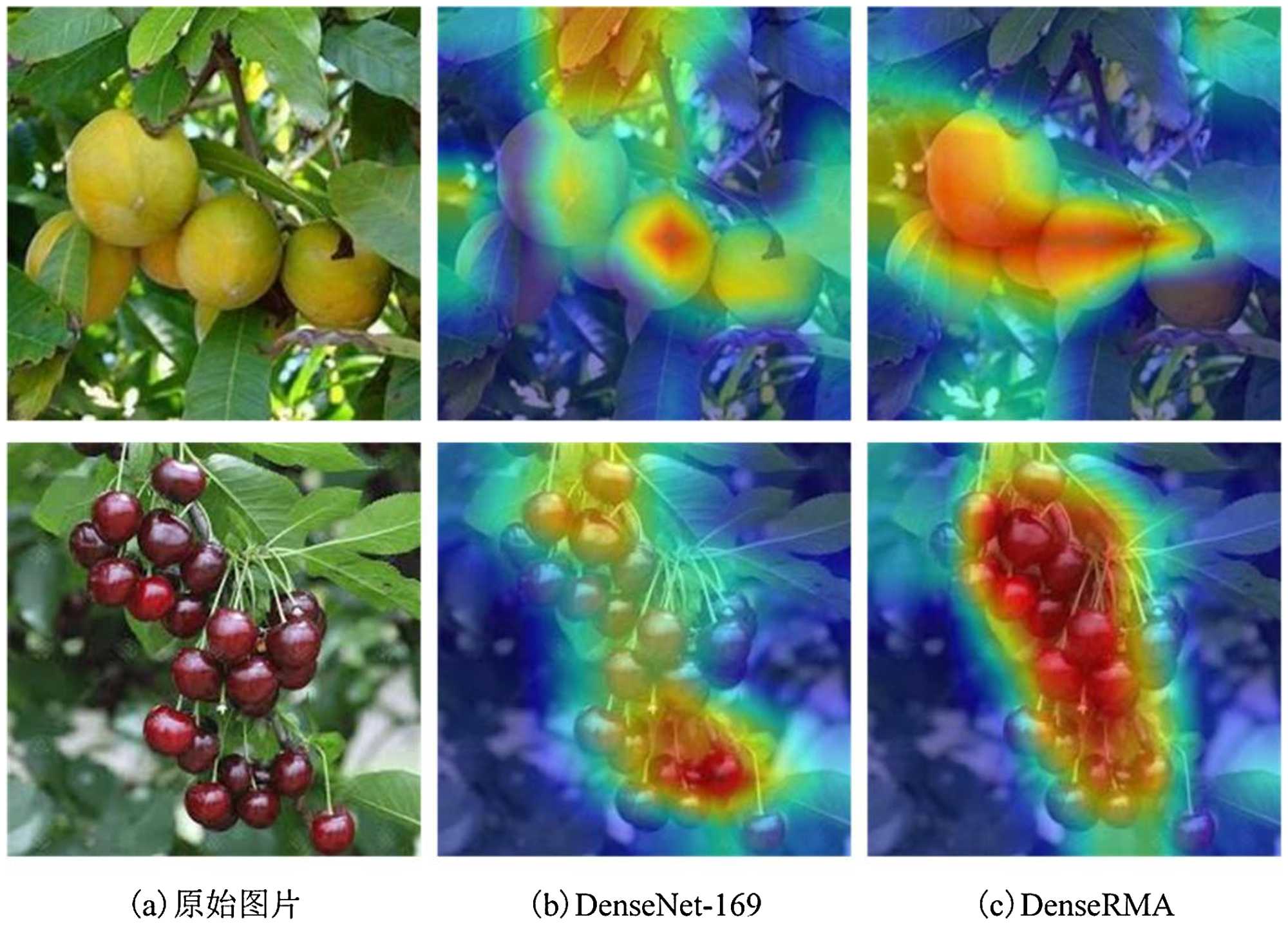同時(shí)為了直觀展現(xiàn)添加RMA的效果對(duì)比,如圖9使用梯度類激活熱力圖對(duì)Fruits-262數(shù)據(jù)集中部分圖像各區(qū)域受關(guān)注程度做可視化展示,由圖第一行對(duì)比可知,相對(duì)于原始模型DenseNet-169,添加了RMA注意力模型減少了對(duì)背景的關(guān)注,并且加大了對(duì)水果目標(biāo)的關(guān)注,由圖第二行對(duì)比可知,改進(jìn)模型增大了對(duì)水果目標(biāo)的關(guān)注程度與范圍,因此證明了本文改進(jìn)注意力RMA的有效性。