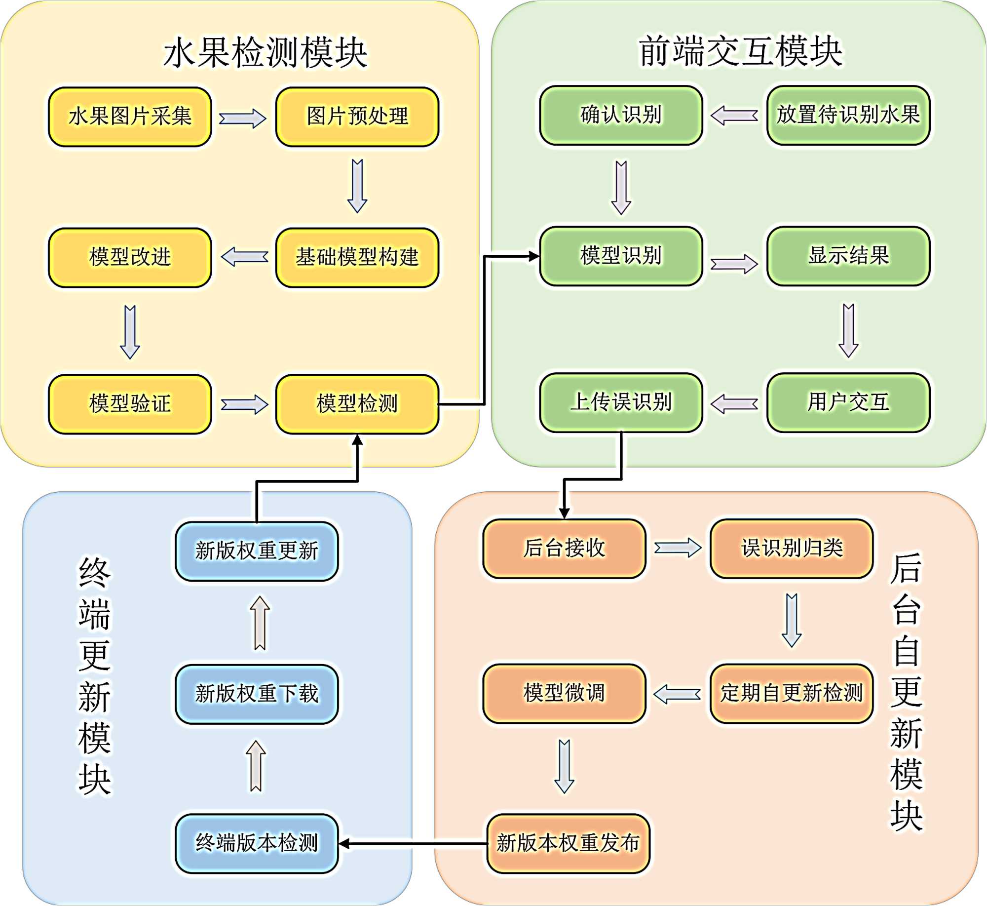 本文系統(tǒng)設(shè)計(jì)框架如圖10所示,分為四個(gè)模塊:水果檢測(cè)模塊、前端交互模塊、后臺(tái)自更新模塊、終端更新模塊。四個(gè)模塊相互連接,形成閉環(huán),實(shí)現(xiàn)系統(tǒng)自更新。系統(tǒng)通過(guò)攝像頭實(shí)時(shí)拍攝用戶購(gòu)買(mǎi)的水果圖像,使用模型進(jìn)行識(shí)別,并在終端界面展示供用戶交互。用戶可在終端界面更正識(shí)別錯(cuò)誤的水果種類,并將正確信息上傳至后臺(tái)服務(wù)器。后臺(tái)系統(tǒng)收集誤識(shí)別圖片,管理人員進(jìn)行檢測(cè)與修正。當(dāng)誤識(shí)別圖片達(dá)到一定數(shù)量,后臺(tái)啟動(dòng)遷移學(xué)習(xí)進(jìn)行模型微調(diào),并發(fā)布新權(quán)重。終端設(shè)備每日重啟時(shí)會(huì)檢查新權(quán)重并進(jìn)行更新。整個(gè)系統(tǒng)實(shí)現(xiàn)了水果圖像自動(dòng)化識(shí)別與模型權(quán)重自優(yōu)化,隨著使用時(shí)間的推移,系統(tǒng)將獲得更大的水果圖像數(shù)據(jù)集和更優(yōu)的模型權(quán)重。