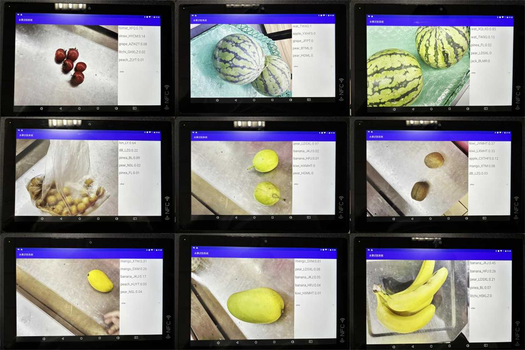 水果檢測(cè)模塊為主要功能,涉及整個(gè)裝置,其整體結(jié)果如圖11所示,該模塊包括攝像頭拍攝模塊、水果展示臺(tái)、終端處理模塊。由用戶將待購(gòu)買(mǎi)商品放入展示臺(tái),并通過(guò)攝像頭進(jìn)行拍攝傳入終端,終端設(shè)備部署識(shí)別程序,對(duì)水果進(jìn)行識(shí)別。模型的部署包括對(duì)所得到的Pytorch模型權(quán)重pth文件進(jìn)行轉(zhuǎn)換為T(mén)orchScript格式,再結(jié)合Android應(yīng)用程序進(jìn)行模型嵌入轉(zhuǎn)換好的模型完成部署。