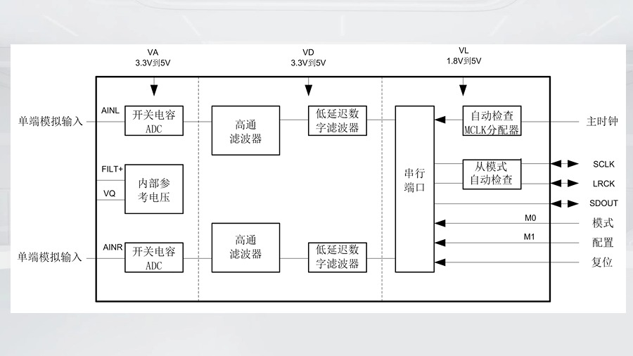 NX5340 是一個完整的模擬到數(shù)字的轉換器,動態(tài)范圍101db,信噪比 -94db,可用于數(shù)字音頻系統(tǒng)。其產品優(yōu)勢主要有以下幾點——