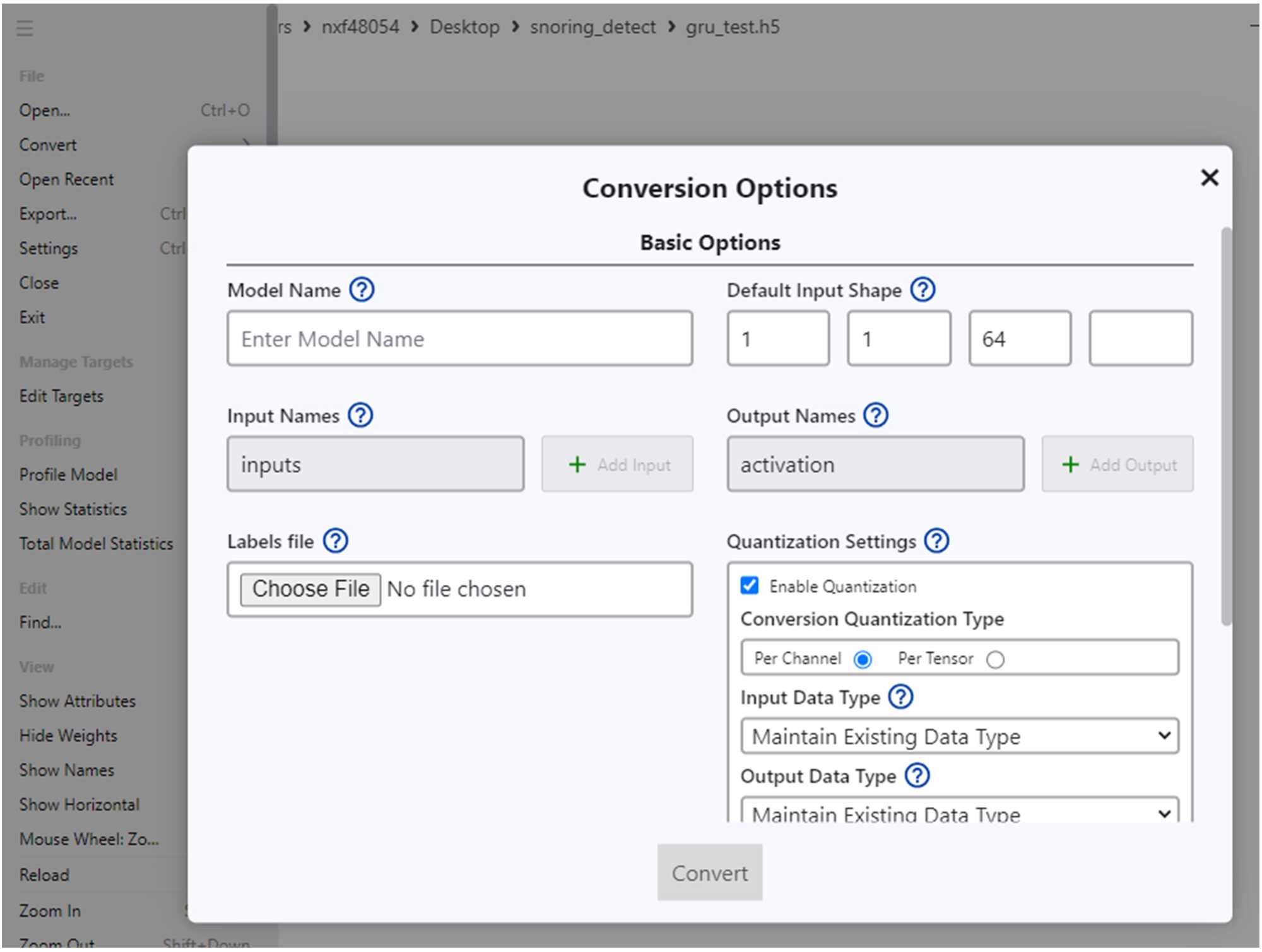 用它打開我們剛才重新制作的模型,點(diǎn)擊左上角的Convert選擇轉(zhuǎn)換工具為Tensor Flow Lite,并勾選Enable Quantization,如圖5所示。