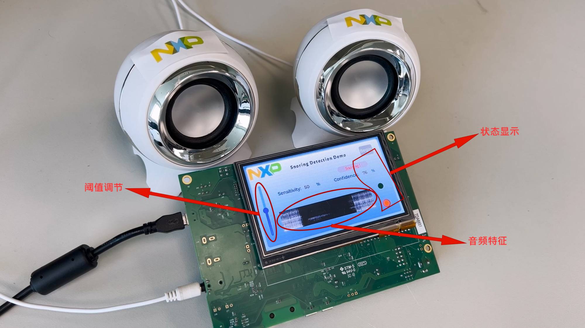 UI頁面主要分為三大顯示區(qū),分別是閾值調(diào)節(jié)區(qū):可以通過滑動條靈活的調(diào)節(jié)檢測閾值,提高系統(tǒng)的抗干擾能力;音頻特征區(qū):顯示當(dāng)前音頻信號的特征圖。狀態(tài)顯示區(qū):顯示當(dāng)前模型預(yù)測結(jié)果,紅燈表示為異常,綠燈表示為正常。