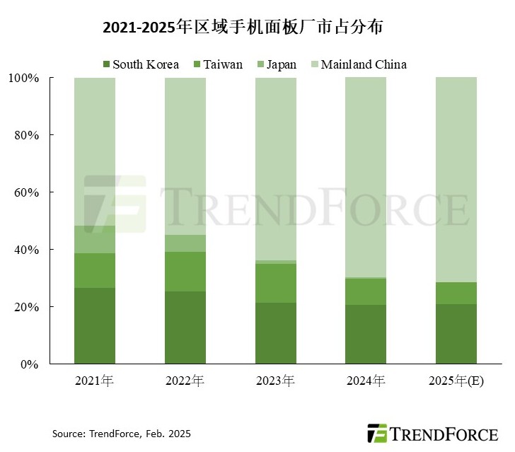 分析各區(qū)域面板廠市占情況:因HKC與CSOT快速成長,臺(tái)系業(yè)者的a-Si LCD市占率逐漸縮小。日系面板廠則退出手機(jī)市場供應(yīng),市占率逐年下滑。相較之下,韓系面板廠憑借高階柔性AMOLED技術(shù)維持在高階手機(jī)市場的優(yōu)勢(shì),2024年市占率約在20%至21%之間。陸系面板廠有中高階AMOLED和低階a-Si LCD需求帶動(dòng),快速擴(kuò)大市占率,2024年達(dá)69.8%,2025年可能超過70%,持續(xù)在全球智能型手機(jī)供應(yīng)鏈中扮演關(guān)鍵角色。