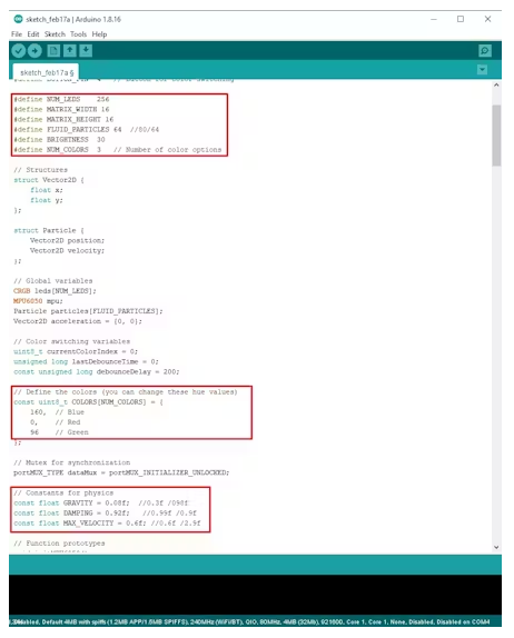 首先,我們可以改變活動(dòng)流體粒子的數(shù)量和led的光強(qiáng)。通過這個(gè)按鈕,我們還可以為前面定義的led選擇三種顏色中的一種。在代碼的開頭,給出了一些顏色的數(shù)值。