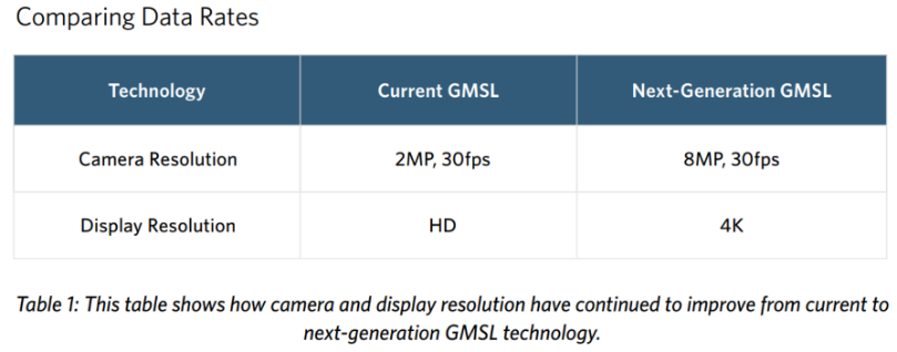 圖:當前與下一代GMSL支持的攝像頭及顯示分辨率