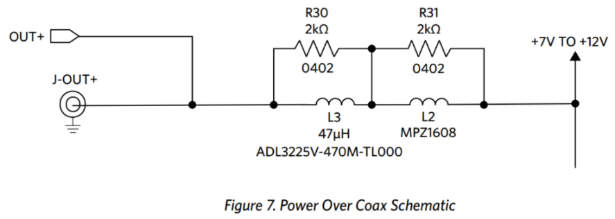 GMSL支持Power Over Coax(同軸供電)功能,要實現(xiàn)此功能,同軸內(nèi)導體頻譜被分為三個頻段:供電、反向信道數(shù)據(jù)、前向信道數(shù)據(jù),如下圖所示。通過濾波將確切的頻段分配至對應(yīng)的電路。數(shù)據(jù)通道為AC耦合,通過收發(fā)機輸入端串聯(lián)電容實現(xiàn)。