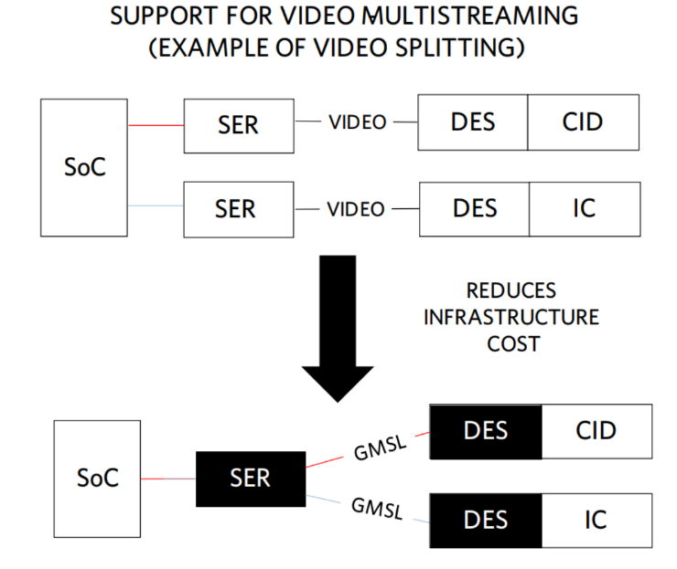 GMSL SERDES芯片自帶SSC功能,以降低鏈路的EMI干擾??紤]到附加的供電與地線要求,GMSL芯片也具備power-over-coaxial架構(gòu)來應(yīng)對降低車重的挑戰(zhàn)。具備雙向控制信道。為了降低系統(tǒng)成本減少設(shè)計時間,GMSL具備菊花鏈式連接多個攝像頭模組的能力。