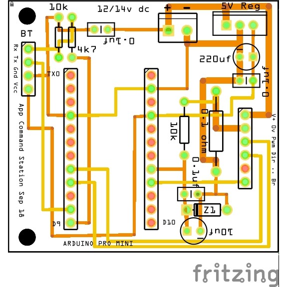 在之前的DCC無線系統(tǒng)工作的基礎(chǔ)上,我開發(fā)了一個藍牙指揮站,連接到一個基于Arduino的接收器電路,帶有HC-06 BT模塊和一個提供2安培的LMD18200 h橋電機驅(qū)動器。