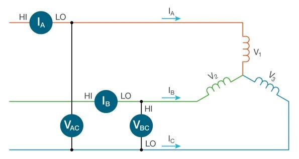 使用兩個電壓通道和兩個電流通道(2V2I)測量三相三線系統(tǒng)