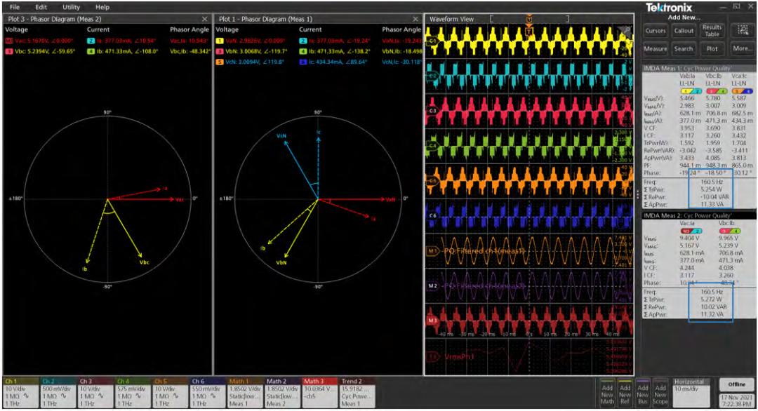 盡管在三線系統(tǒng)中只需要兩個功率表就可以測量總功率,但使用三個功率表具有一些優(yōu)勢。三功率表配置需要六個示波器通道:三個電壓通道和三個電流通道。