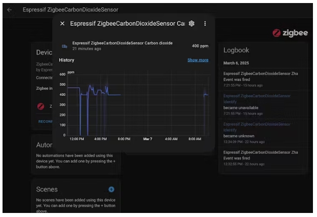 查看歷史二氧化碳趨勢(shì)。值得注意的是,在這段時(shí)間里,我的設(shè)備并沒(méi)有連續(xù)運(yùn)行。