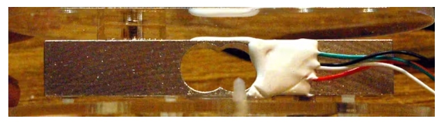 在上面的測(cè)壓元件中,鋁塊被擰在右邊的底板上,而左邊則是稱(chēng)重平臺(tái)。即使是非常輕的物體(比如0.9克的一張紙)也會(huì)在金屬中引起微小但可測(cè)量的變形。