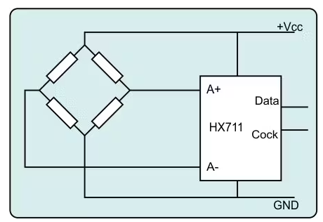 應(yīng)變片是在塑料基板上的極薄導(dǎo)電軌道。當(dāng)測(cè)壓元件彎曲時(shí),這些軌跡變得稍微更長(zhǎng)和更窄,導(dǎo)致電阻的微小變化。在橋接電路中,這個(gè)微小的信號(hào)被HX711放大并數(shù)字化。