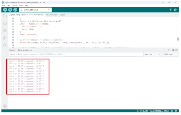 在對XIAO ESP32C6進(jìn)行編程并成功連接HomeAssistant后,還可以通過串口查看當(dāng)前的溫濕度值:
