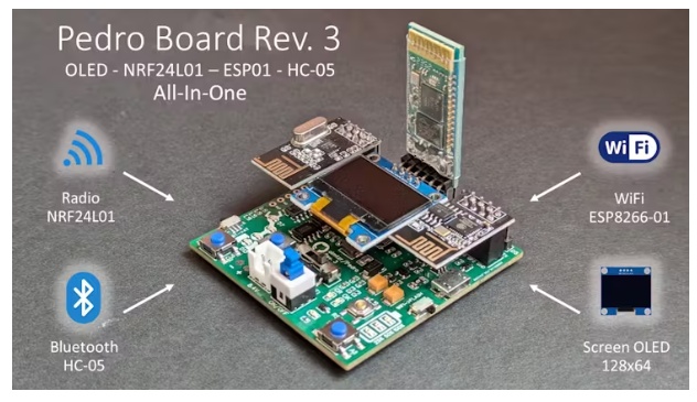 Pedro提供多種無線通信選項(xiàng),其集成的nRF24L01模塊用于遠(yuǎn)程控制,HC-05藍(lán)牙模塊用于智能手機(jī)連接,ESP8266 WiFi模塊用于物聯(lián)網(wǎng)集成。它還具有一個(gè)128x64的OLED顯示屏,允許實(shí)時(shí)反饋和數(shù)據(jù)可視化。