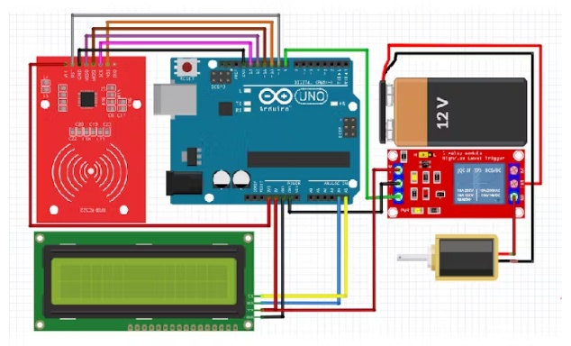 下面的RFID門鎖系統(tǒng)電路圖展示了Arduino、RFID模塊、繼電器模塊、電磁鎖和LCD顯示屏如何連接在一起,以創(chuàng)建一個安全的自動門鎖系統(tǒng)。