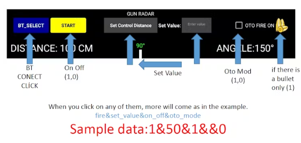 傳感器和伺服電機(jī)數(shù)據(jù):雷達(dá)系統(tǒng)通過(guò)藍(lán)牙將距離、角度和發(fā)射信息發(fā)送到移動(dòng)應(yīng)用程序。