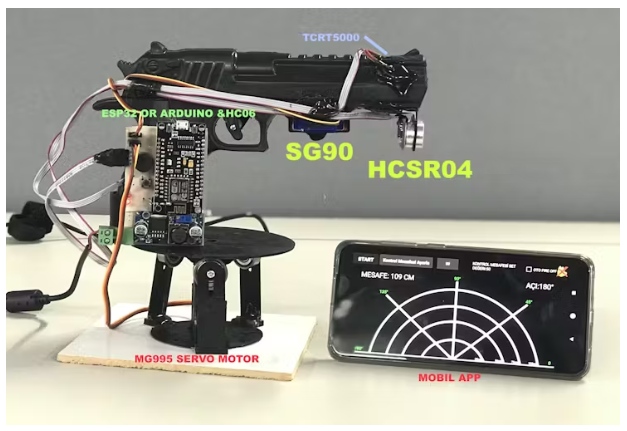 本項(xiàng)目是一個(gè)由超聲波傳感器和伺服電機(jī)驅(qū)動(dòng)的雷達(dá)系統(tǒng)。該系統(tǒng)可以檢測(cè)障礙物并收集距離和角度信息,并且可以通過(guò)移動(dòng)應(yīng)用程序通過(guò)藍(lán)牙進(jìn)行控制。該系統(tǒng)為用戶提供了目標(biāo)識(shí)別和自動(dòng)射擊等功能。