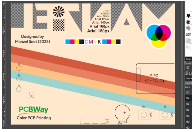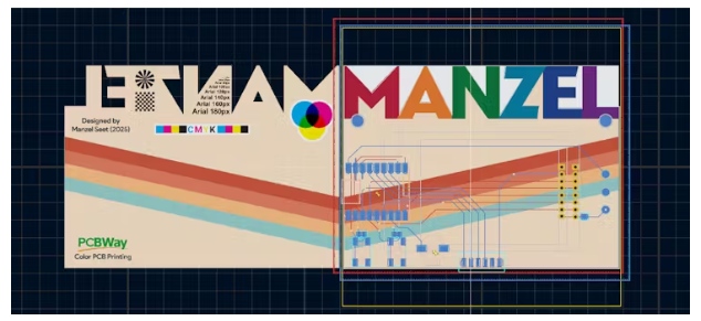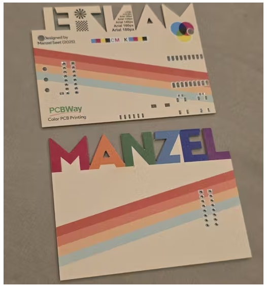 這個設(shè)計的靈感來源于一個復(fù)古的彩色主題,上面貼著我的名字字體。板的輪廓是有趣的,因為它是一個奇怪的形狀周圍的字母,這將展示PCB制造的能力。