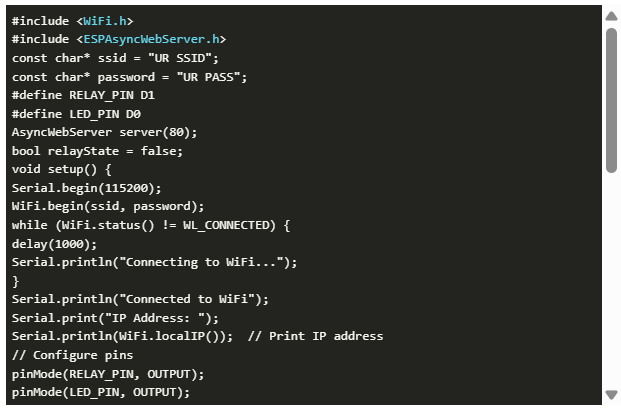 這段代碼創(chuàng)建了一個(gè)帶有web界面的智能WiFi插頭,允許您切換繼電器(連接到設(shè)備)和用于視覺(jué)反饋的LED。