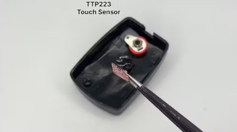 ?刮掉TTP223傳感器“Touch”標(biāo)記區(qū)域的保護(hù)層,露出銅墊。