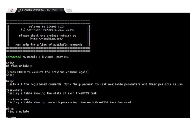 為了訪問計(jì)算機(jī)的串行COM端口,請使用您首選的串行終端仿真器工具,并通過USB-to-UART電纜到達(dá)Hexabitz CLI。