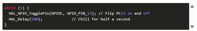 打開‘ Core/Src/main.c ’并找到‘ while(1) ’循環(huán)。添加: